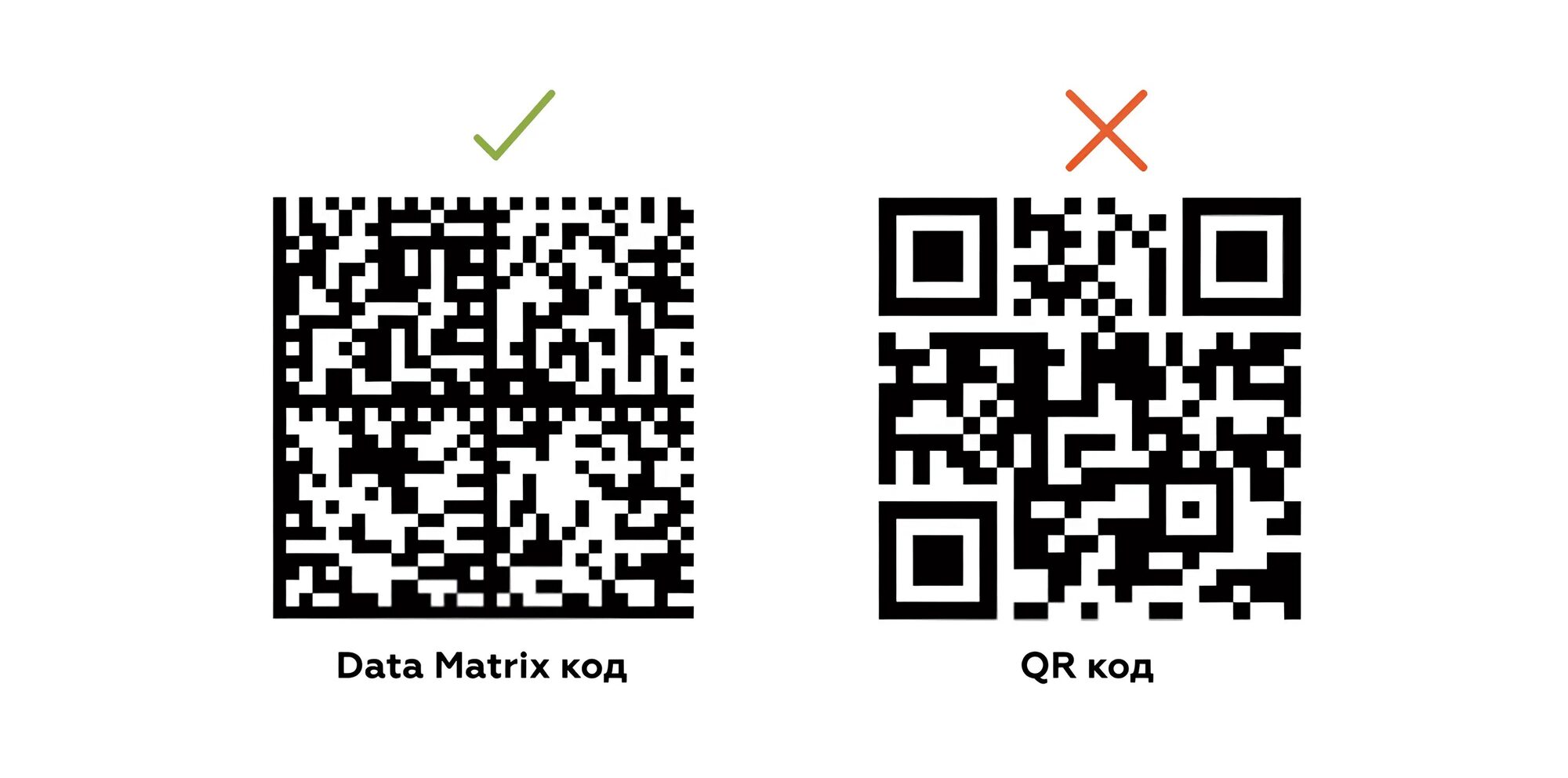 - Преимущества перед QR-кодом: Data Matrix был выбран для маркировки в России, так как он более компактен при том же объеме данных. Минимальный размер Data Matrix может составлять 10x10 модулей, в то время как минимальный размер QR-кода — 21x21 модуль.